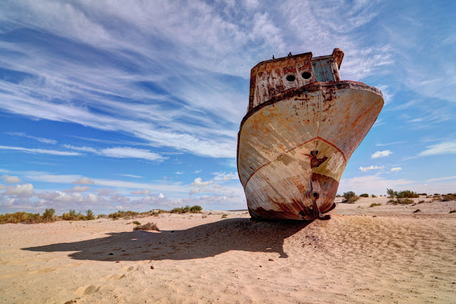 ولكن منذ عام 1960، كان بحر آرال يتقلص بسرعة نتيجة لتحويل المياه والإفراط في استخدام مياه النهر لأغراض الري. ما كان يومًا ما بحرًا أصبح الآن صحراء ممتلئة بالسفن القديمة بالشاطئ ، وموجودة إلى الأبد في تذكير تقشعر له الأبدان للتوازن الهش بين الطبيعة والبشر.